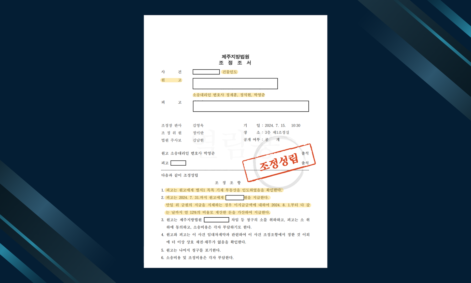 조정절차에서도 상대방을 잘 설득하는 경우, 실질적으로 전부승소판결과 동일한 성과를 이끌어낼 수 있습니다.